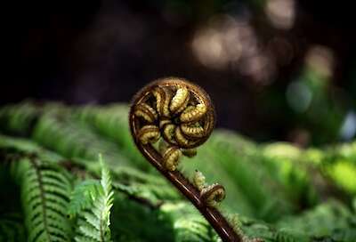 „Koru“, der sich gerade entrollende Wedel eines neuen Silberfarns in Neuseeland. Koru ist für die Maori, die Ureinwohner Neuseelands, Begriff und Symbol für neues Leben. Zu finden ist dieser Koru in diesem Stadium nur schwer, weil er verborgen unter dem Schutz der großen Farnblätter heranreift. Nicht nur die Schönheit dieses Koru und seine Symbolik berühren, sondern insbesondere die Tatsache, dass dieses neue Leben geschützt im Verborgenen heranwächst.